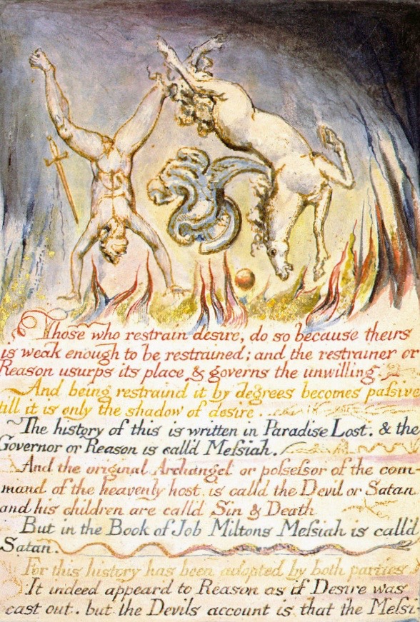 The essence of false (Miltonic) theology, Blake argues, is in the centrality of control – ‘reason’ taking charge of desire, with the result that desire itself is cast as ‘evil’ and good becomes an exercise in damage limitation which seeks to keep desire within bounds; and, conversely, desire will then always appear as rebellion. Milton’s Christ is the one who is victorious over desire; Milton’s Satan is the commander of heavenly energies in rebellion.