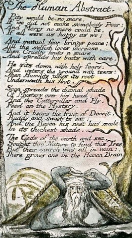 Somewhere between the opposing rhetorics of ‘The Divine Image’ and ‘The Human Abstract’ (and the tension between the titles itself, between ‘image’ and ‘abstract’, declares a major theme), Blake is taking soundings for an understanding of how to ‘image’ the divine which is a fair way on from the simplicity of the earlier poem.