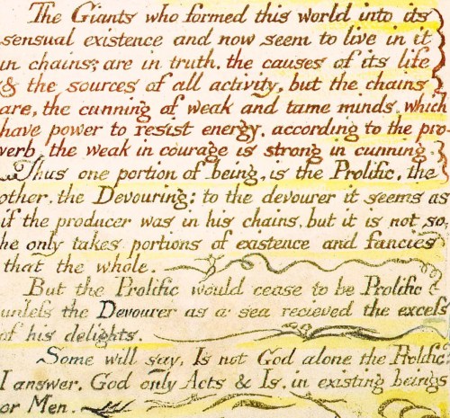 This is not to say that Christ or the true Christian faith is a means of reconciling opposites. Later in The Marriage, Blake famously contrasts the Prolific and the Devourer – the productive energy from which life comes and the principle of separation or what we could call specificity, essence within bounds. The latter is unaware of the excess of being which surrounds every boundary; yet the former could not exist in actuality without its excess being continually absorbed in the particular – that is, without the indeterminate productive energy at the source of things being embodied in a presumably infinite variety of actual and imaginable forms.