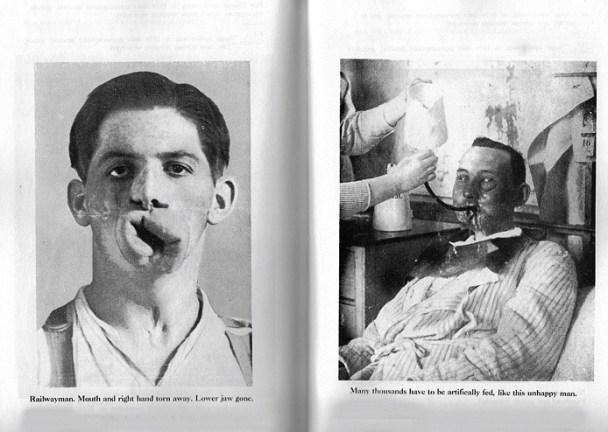 What has been torn away in these photographs is not only the mask of men’s faces but of war itself – the “beautiful phrases”, the old lies. It is the aesthetic nature of all this that is one of the most disturbing and puzzling aspect of Friedrich’s collection (and it may be significant here that he originally hoped to become a sculptor or artist, and later had close links with the Expressionist movement). It’s the same problem that confronted Owen in writing poems, and McCullin in taking pictures: how do you use a medium posited in many senses on beauty, to show not merely the horror, but also how the medium itself is in a sense part of the problem.
