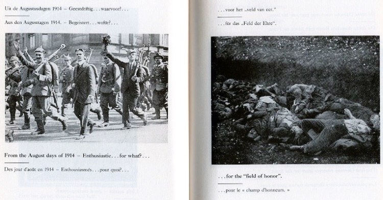 The book itself is a mixture of drawings, posters, children’s war games (today these might be represented by Call of Duty, Medal of Honor, Battlefield 3) – to suggest where the military training actually starts – as well as the war photographs themselves. The force of the images is partly in their juxtaposition: soldiers eager to go to war in 1914 on one page, next to a heap of tangled corpses on the next – suggesting the actual nature of the of the “field of honour” into which they are unconsciously marching. But it also implicitly points out the highly selective editing of photography that goes on in mainstream publications – how pictures from the very same reel might be selected, filtered, in order to bolster whatever narrative the newspaper is taking. A German father looks proud, in his soldier’s uniform, amongst trees in France; two days later we see him again, dead and faceless amongst the mud. Perhaps unsurprisingly only the first made it into the Illustrated Family Journal.
