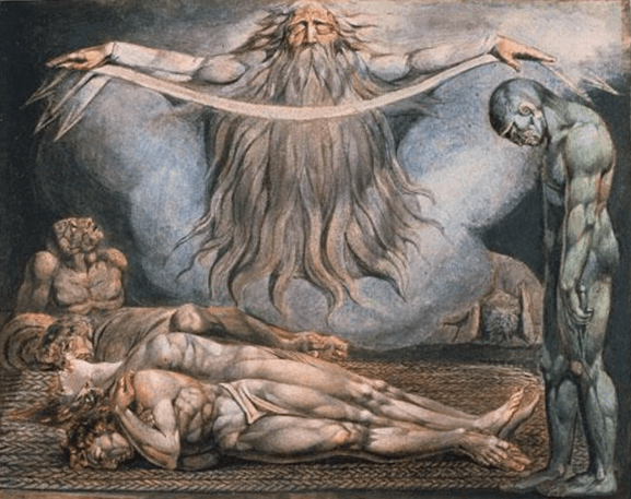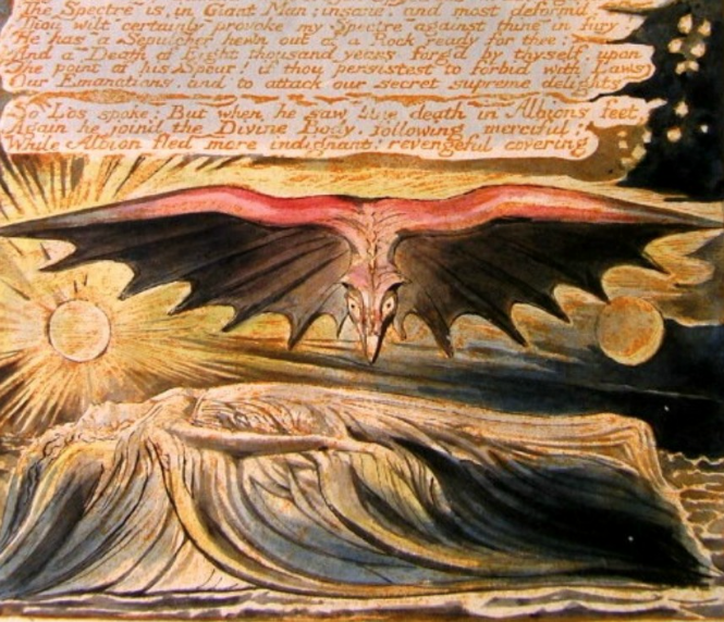 Disembodied rationalism is a major source of this loss. As the divine spark that is in fallen man is hidden, Blake saw that ‘the Reasoning Spectre/Stands between the Vegetable Man & his Immortal Imagination’. (Jerusalem). The Spectre is ‘a false Body: an Incrustation over my Immortal/Spirit; a Selfhood’ (Milton). It declares in Jerusalem: