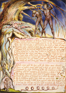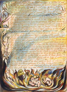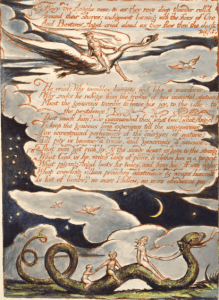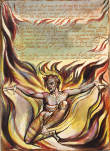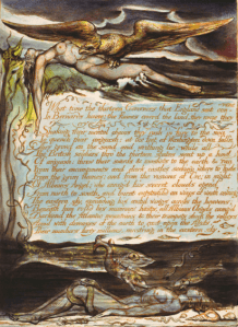 For Blake, the Biblical flood symbolized the immersion of Eternity in the turbid murk of material existence. One of the consequences of this cataclysm was to separate America (which represents the body) from Europe (which stands for the imagination.) America is a symbol of liberty for Blake, but liberty understood in very physical terms. Blake intuited, it seems, that “the American Dream” was a very right-now and materialistic one.