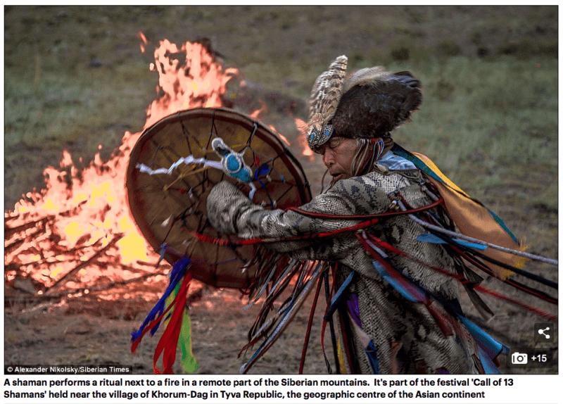 According to E. R. Dodds, many of the rituals and doctrines concerning the separation of the ‘soul’ from the ‘body’ were derived from northern shamanism. In these remarkable photographs of contemporary Siberian shamanic practice we can see many of the ancient elements: drumming and trance states; the ba-like bird feathers in the head; the polarity of fire and blood as symbols of this psychic division; the animal sacrifice and ritual of blood; the hostility of the landscape suggesting the traumatic basis of such rituals.
