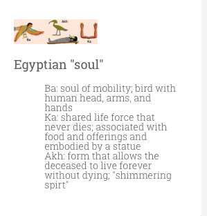 Ba, ka, and akh: The ba was considered to be an individual’s distinctive manifestation similar to our concept of personality. It was necessary for the deceased to journey from their tomb to unite with their ka (life-force) if they were to be transformed into an akh (star). An akh was regarded as enduring and unchanging for all eternity and it was the goal of every Egyptian to become one.