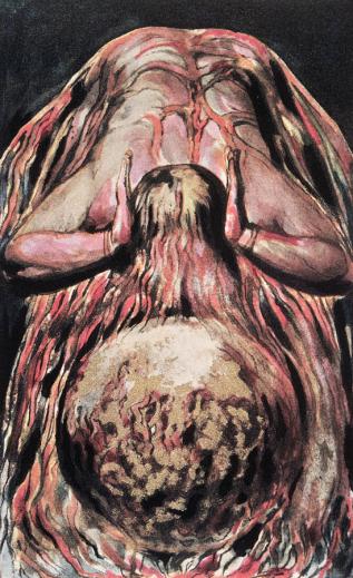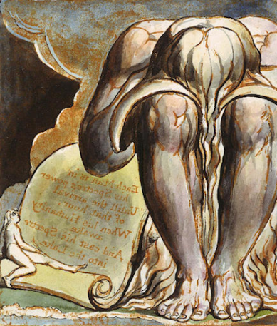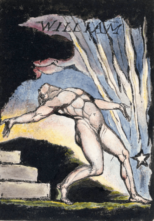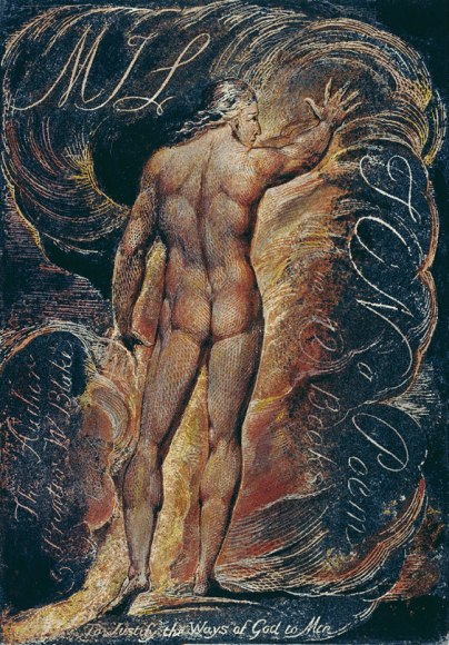 ‘A nude male, almost certainly Milton or a compound of Blake and Milton, strides away from us and into his book, perhaps leading us forward into its depths. Milton may be entering his ‘Own Vortex’. His right arm and hand also cut his name in two, an action suggesting that the route to apocalypse is blocked by a ‘selfhood’ that must be self-annihilated’ – Essick & Viscomi