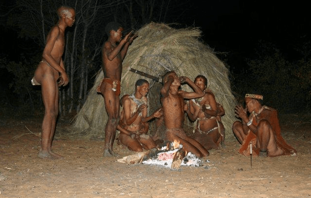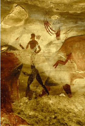 “Stages of induction are often indicated in the paintings by characteristic nose-bleeds and leaning forward poses”. In this southern African San rock painting an antelope-headed figure wears a white kaross (skin cloak). Note the blood falling from its nose; it indicates that the ‘being’ is a San shaman who has entered an altered state of consciousness and thus travelled to the spirit world where people assume animal features.