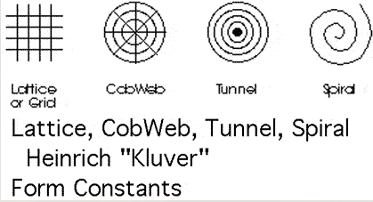 There are four Klüverian form-constants of geometric visual hallucination: (a) tunnels / funnels (b) spirals (c) lattices and (d) cobwebs / concentric circles (Klüver, 1966). Mathematical corroboration, completed in two stages in 1979 and 2001, provided reverse proofs of Klüver’s taxonomy by demonstrating a viable geometry for this retinocortical map (Ermentrout and Cowan, 1979; Bressloff et al., 2001).