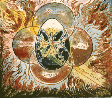 The Mundane Egg in the Mundane Shell: ‘Blake’s idea of ‘the Mundane Shell’ startlingly mirrors aspects of prehistoric rock art’. “We live in the mundane egg surrounded by the mundane shell. The egg is the physical world where we perceive with our physical senses. All which is experienced in the mundane egg is projected on the mundane shell which surrounds and encloses the physical world. Recorded on the mundane shell are the images of the history of what happens within time and space. The mental world is represented by the worlds of Tharmas, Urthona, Luvah and Urizen, who overlap the mundane egg. The earth is entirely within the world of Urthona and is impinged upon by the worlds of Tharmas and Luvah. The world of Urizen is within the mundane egg but outside of the earth. Within the mental world of Urizen it is the state of Satan. The void is outside of existence surrounding the mental worlds.”