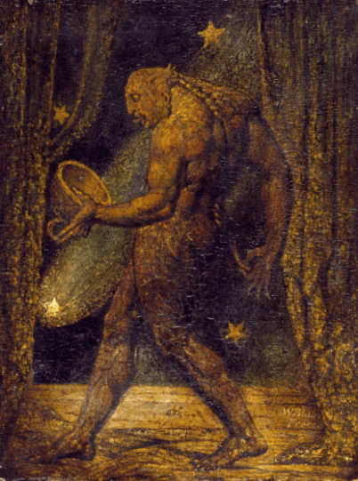Crucially, both Blake and /Xam therianthropized the things they saw in the spirit world. One of Blake’s most significant examples of this practice is The Ghost of a Flea (c. 1819-20), a tempera developed from the ‘Visionary Heads’ pencil drawings made for John Varley (tempera with gold on panel, Tate Britain).