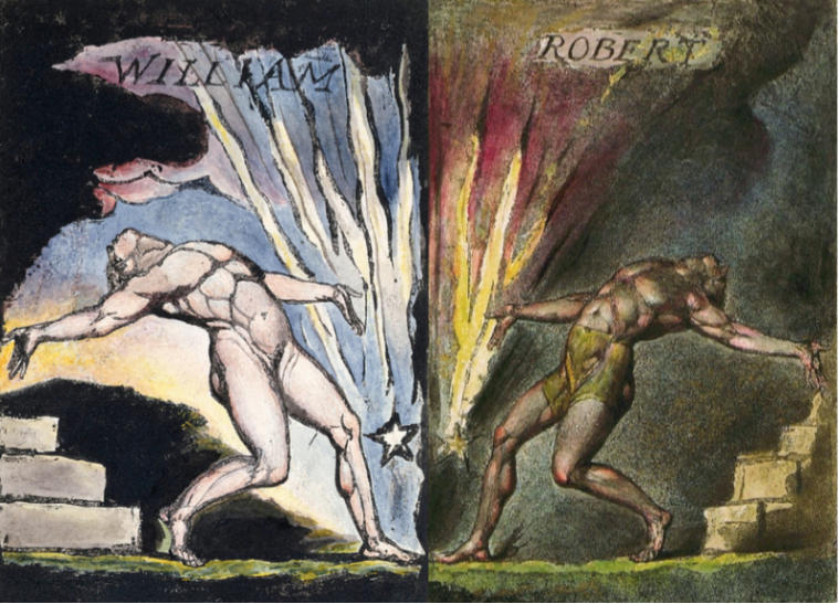 Strikingly, within Milton’s visual and verse narrative, Blake’s fall (‘I fell’) also references two extraordinary full plate designs, one simply labelled in etching ‘William’ and the other ‘Robert’. Both have a falling star which Blake links to a manifestation of the poet John Milton’s return to earth and entry into his body: