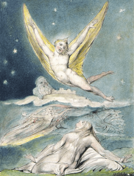 In the single temporal moment of Milton, after the vortex is passed, the Lark rises. That Blake freely therianthropized larks is evidenced from his design, Night Startled by the Lark, for Milton’s L’Allegro, to which he appended his own commentary, ‘The Lark is an Angel on the Wing’. Milton provides a profoundly complex description of the Lark’s mediating role in visionary experiences: