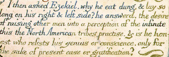 “the ability to write from right to left in mirror writing”: Blake’s dexterity and tool-using skills are evident throughout his work. All of his regular illuminated pages would have been written ‘backwards’ so that when printed they appeared correctly. He even plays with the idea, as in this image from Jerusalem, where he deliberately writes in code – the reader has to use a mirror to decipher the true meaning.