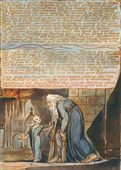 Indeed London is himself a character in Jerusalem: “My Streets are my Ideas of Imagination … /My Houses are thoughts: my Inhabitants, Affections, /The children of my thoughts walking within my blood vessels” (J 38). London, like an individual, is capable of sacrifice: ” ‘I give myself . . . for Albion,’ / So spoke London, immortal Guardian” (J 38). London is not always so strong and appears differently in sorrow: “I see London, blind and age-bent, begging thro’ the Streets /Of Babylon, led by a child; his tears run down his beard. . . . The Corner of Broad Street weeps; Poland Street languishes” (J 84). Blake interprets the city feelingly, affectively, whether in its strength or woe.
