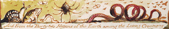 Lively little creatures are drawn: a snail, a frog, a moth, a spider, and a worm. Blake has deliberately avoided drawing the visions of Golgonooza and of the fourfold Albion. That work is left to the reader, who is called upon to create these images in his own multi-dimensional mind. Thus, two of the most significant “pictures” of the poem have been left to us to complete and, in so doing, participate in the building of Golgonooza and the rejuvenation of Albion.