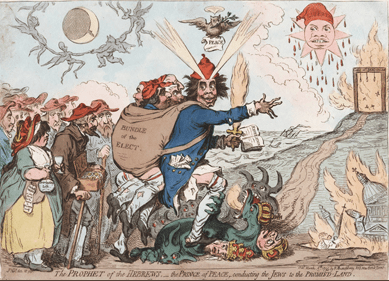 Richard Brothers, dressed as a sans-culotte and with the face of a maniac, carries on his back a ‘Bundle of the Elect’ from which protrude the heads and legs of Fox, Sheridan, Stanhope and Lansdowne. In his left hand is an open book: ‘Revelation’, and a sword of flame, his right hand points up an ascending path to the ‘Gate of Jerusalem’ (right); this is a gallows from which hang three nooses; behind it are flames in which demons are flying. He tramples on a seven-headed monster (the Beast of ‘Revelation’): on one head, that of the Pope, he puts his foot, another prostrate human head wears a crown and so does the head of a beast breathing fire. In the midst of an increasingly global war, exorbitant taxes, and food shortages, Brother’s view of a world gone horribly awry gained traction among those members of the working class who were most affected by the shortages. Gillray dutifully presents Brothers without breeches (sans-culotte) and with his pockets stuffed with French Assignats (the Revolutionary currency) – suggesting that Brothers may be in the employ of France, hence guilty of treason. The Pitt government duly had him arrested for sedition and he spent most of the rest of his life in an asylum.