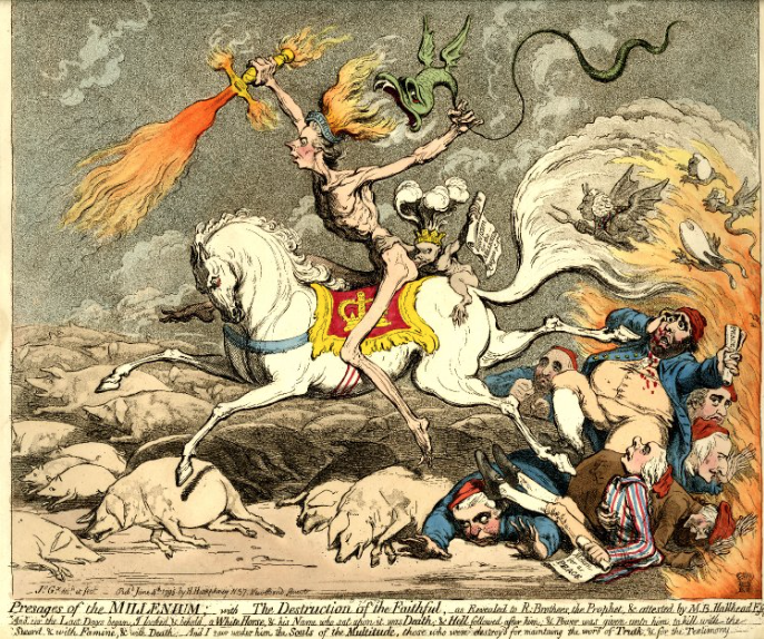 Pitt as Death on the pale Horse rides naked on the White Horse of Hanover, galloping over the prostrate bodies of pigs. Gillray’s title continues: “with The Destruction of the Faithful, as Revealed to R. Brothers, the Prophet”.