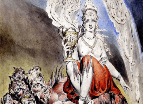 Blake would later go on to elaborate this conception in pictures like The Whore of Babylon and the Dante illustrations of Philip the Fair embracing Beatrice, and he would introduce it near the end of Night the Eighth of The Four Zoas, where John of Patmos “saw the Harlot of the Kings of Earth & saw her Cup / Of fornication food of Orc & Satan pressd from the fruit of Mystery”.