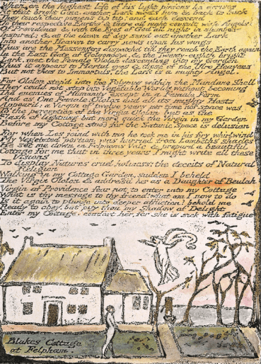 During the only period he lived away from London, Blake underwent what he describes in a letter-poem to his friend Thomas Butts as nothing less than a personal Last Judgment, a harrowing experience which involved a crisis of faith in himself and his friends, as well as an accusation by the spectres of “Poverty, Envy, old age & Fear.” These demons hounded him until he found the strength to resist and defeat them in what he calls a “fourfold vision”.