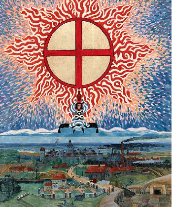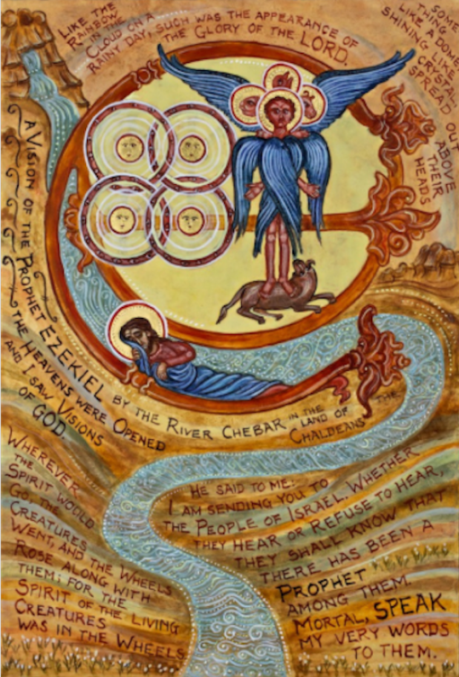 ‘Ezekiel’s Wheels’, which features the human fourfold man, his hand raised in a sign of peace above the wheels whirling in flames. The awakened sleeper, Ezekiel himself, is depicted at the bottom of the picture, lying on a rock beside the river.