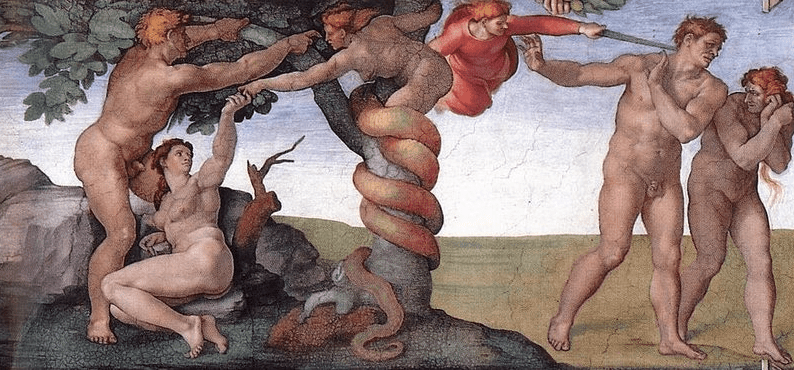 “If they accept this invitation not to consider these images at a distance but to embrace them, they will be liberated with Blake from the bondage of doubt, and will wake from the nightmare of separation from each other and the natural world.” The chariot here is another parody. The work is popularly titled ‘God Creating Adam’. It might as well be titled ‘Adam Judging God’. It is a letf-brain parody of the true imaginative Chariot: God’s tired, dead chariot is drawn by the horses of instruction – moralising rationality; man has allowed his own superego to bow and burden him. The gesture of God’s right arm and hand and the suggestion of a sword or shaft extending from his hand to Adam’s head recall the gesture and sword of the angel expelling Adam and Eve from Paradise.