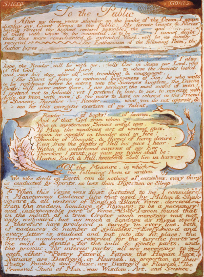 Opening address of Jerusalem. Each of these introductory proems reveal a different aspect to the work, and a different readership. Wheels within wheels. Note how the page itself is headed: the words “SHEEP” and “GOATS” either side of ‘To the Public’.