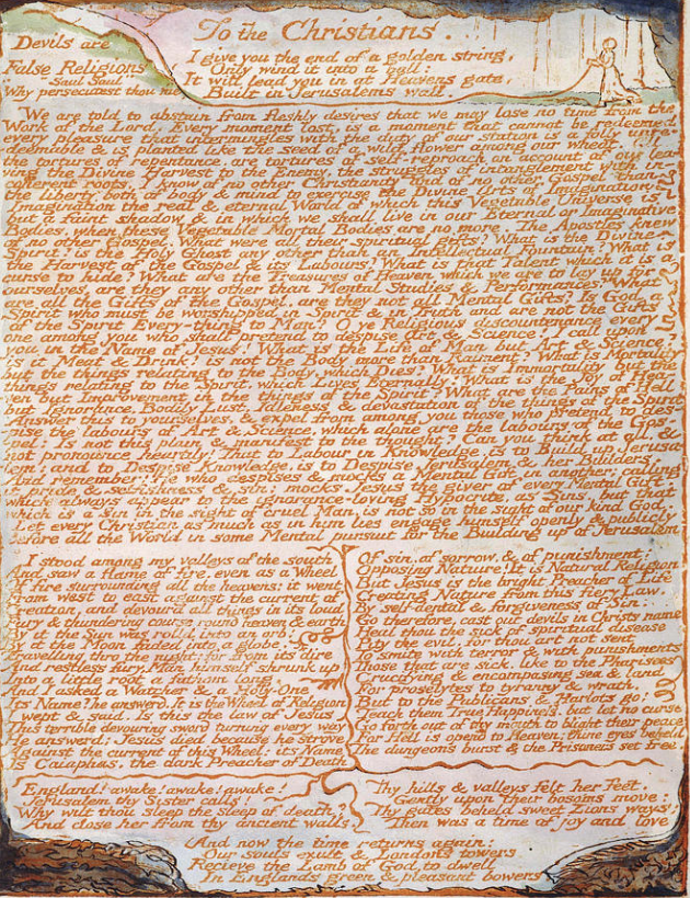 This stone dungeon bursts open in the proem to the transformations of the last chapter and becomes Mt. Zion in Jerusalem. Prefacing an address to the “Christians,” the emphasis here is fittingly placed on the resurrection of the Lamb of God, who symbolizes the Imaginative Body as opposed to the vegetable or mortal body. This returns us to the hope that Blake expresses in his introduction to the “Giant form” of Jerusalem, that “the Reader will be with me wholly One in Jesus our Lord”.