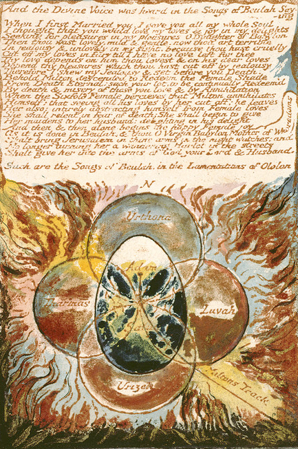 As an orator Blake is a literalist, both verbally in his expository, declarative language, and visually in his schematic tendency, as in the diagram on Plate 36 of Milton of the Mundane Egg surrounded by the four universes.