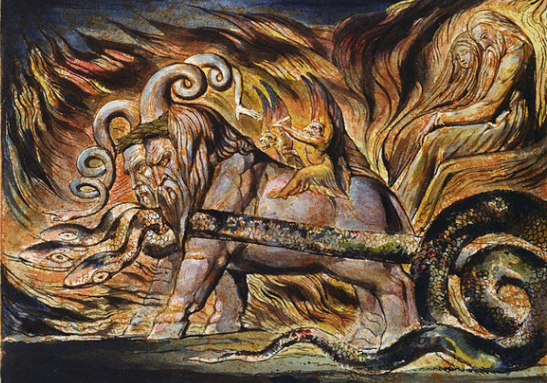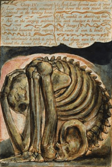 Torn to pieces, his “ribs of brass, starry, black as night,” mock the rainbow of true vision. He lies brooding on “ridges of stone” beside “the Dragon of the River” Euphrates in a parody of Ezekiel’s landscape, while his “Furnaces of iron” and black wings mock Ezekiel’s vision. Furthermore, in a parody of Los’s Jerusalem-Cherubim witnessing to the unity of vision and its scene, his stomach devours its landscape “From Babylon to Rome … the World of Generation & Death”. Hence, the Covering Cherub can no longer be mistaken for anything other than a “majestic image/ Of Selfhood, Body put off, the Antichrist”. So ends his masquerade.