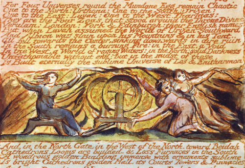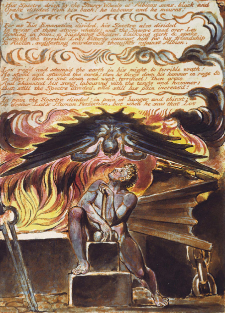 Consequently, we again see fallen Albion lying on his rock by “London’s River” (the Thames, 16:40), his counties fleeing out of the temple-city gate, and as a result the wheels of the Cherubim vision are “wheel without wheel, with cogs tyrannic / Moving by compulsion each other: not as those in Eden: which / Wheel within Wheel in freedom revolve in harmony & peace”. These wheels of compulsion are those of mental and physical slavery, the “loom of Locke” and the “Water-wheels of Newton.” Hence, the furnaces separate from them and become for Blake the literal sacrifical altars of English sweatshops.