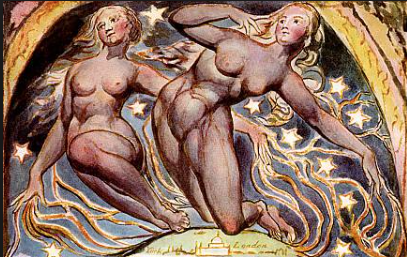 What do you see? If you see a picture of a woman on a flower, you are already seeing through the eyes of Vala, who we see here, staring plaintively at her own navel. Like everything else ‘natural’ it is a parody: her wings parody the butterfly wings of Jerusalem.