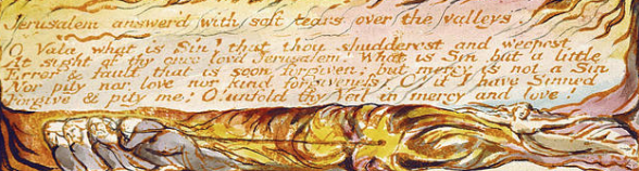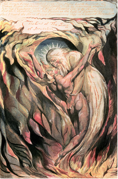 In Albion’s resurrected body, the new Jerusalem, there is no accuser causing fear and doubt because there is no self-division. Here, in Blake’s last Cherubim transformation of his phophecy, the “Hand of Man,” like that of the man in linen commanded to go between the wheels of the Cherubim and gather coals to scatter over the city in a prophetic gesture (Ezek. 10.2), “grasps firm between the Male & Female Loves”, between the furnace of beryl and the wheels of the loom. Blake has not arrived at ecstasy, but he has reached out with his firm engraver’s hand and achieved the prophetic end of rebuilding a people and a city by transformations of Ezekiel’s Cherubim, whose wings weave forgiveness of oneself as well as others. Its body is for Blake a symbol of the unity of man and his imagination, of inside and outside, the visual and the verbal; but it is also a body in the most literal sense—Jerusalem itself.