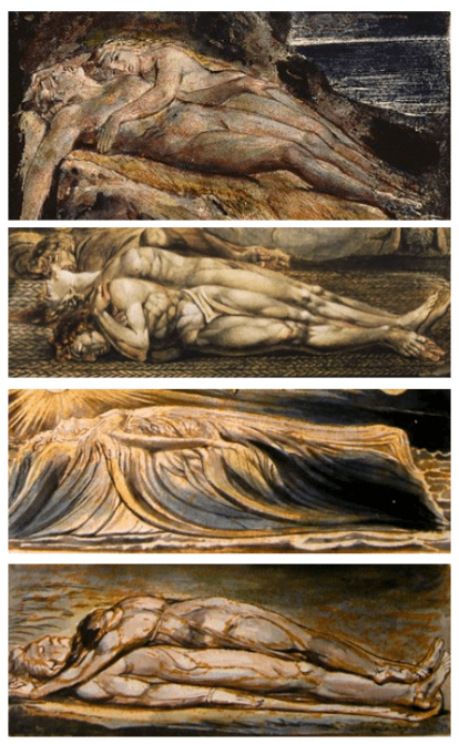 Here the “Four Living Creatures” frame a celebration of resurrection in which everything—animal, vegetable, mineral—becomes individuated living being that appears united in the “One Man” of Ezekiel’s vision. Furthermore, Blake makes it clear that these “Visionary forms dramatic” or Cherubim is the “exemplar” of all true art, including his own prophecy—Jerusalem. This is why, when Blake in a later work, The Laocoön, condemns classical art for being mere “mathematical diagrams” as opposed to the “Naked Beauty displayed” of prophetic art, he further and more damningly accuses it of being a debased copy of the “Cherubim of Solomon’s Temple” reflected in Ezekiel’s vision.