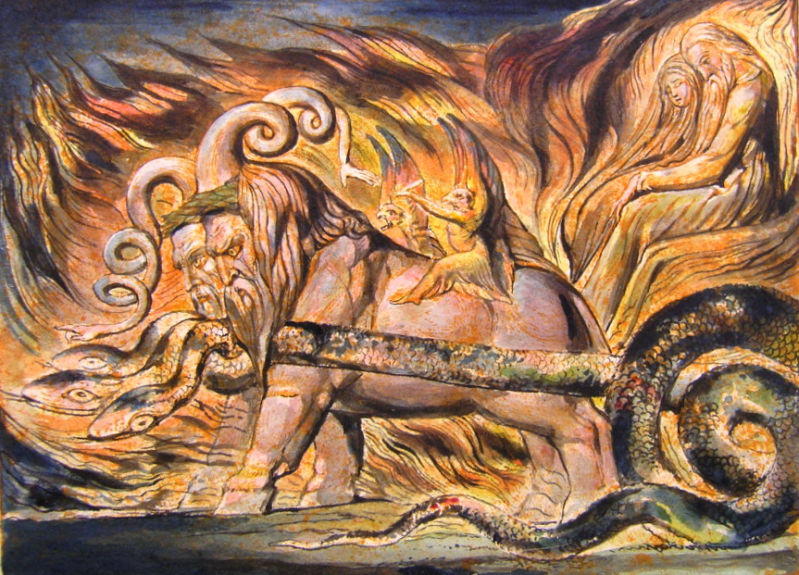 Ezekiel vows to destroy the tyrannous “Cherub” appearing, like the Cherubim itself, as a man “midst of the stones of fire”. This satanic being is in Jerusalem the “Selfhood” and the Spectre of self-doubt, the destroyer of brotherhood and prophetic faith masquerading as the true Cherubim. As the Cherubim is perverted by false artists, such as the Greeks, it becomes a parody of itself, the Covering Cherub, who is exceedingly dangerous because it is so easily mistaken for the true Cherubim.