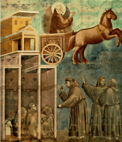 “Traditional Cherubim meditation emphasized watching and waiting for its appearance, clearly distinguishing God the rider from his chariot, whereas Blake emphasizes actively uniting with the chariot.” (Pic: Francis of Assisi, ‘The Vision of the Chariot of Fire’)