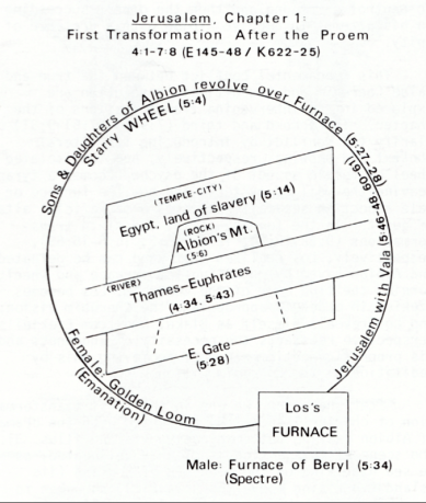 In the first of these (4:1-7:8), Albion asserts his independence and denies his wholeness (4:23), expressed in the exile of vision—furnace and wheel—from its landscape—temple-city—(soul from body, Jerusalem from Albion), but fails to understand the true nature of his circumstances. Albion’s abstracting, self-dividing skepticism splits his person into a contemplator self and its object self.