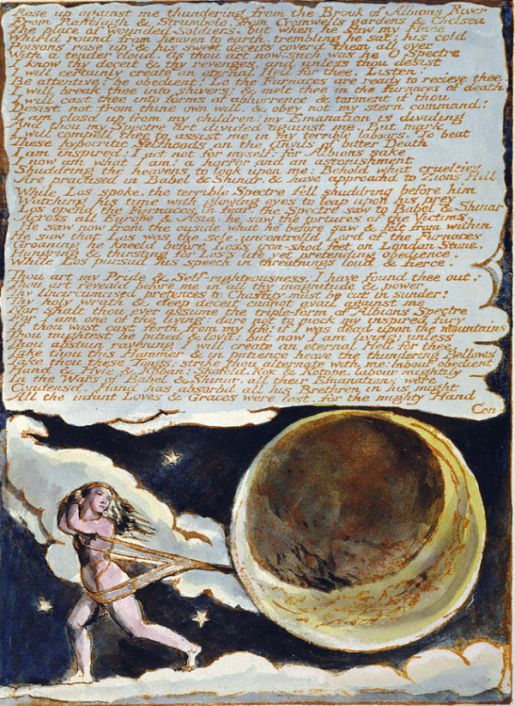 He has entered the Temple as the Abomination of Desolation and driven out the vision of furnace and wheels. In face of this, Los intensifies his labor outside the temple walls at the furnace, convinced that the encircling “Wheels of Albion’s Sons” are ultimately redemptive, “Giving a body to Falsehood that it may be cast off for ever … piercing Apollyon with his own bow!” Thus, the wheel and furnace are not absolutely fallen in their separation. The wheels reach from the “starry heighth to the starry depth” and so by imaginative labor can be used in their fallenness against Hand or the angel of the bottomless pit, as John saw in Revelation (9:11). And out of the furnaces comes imaginative space, Erin, to fill the void between the starry wheels in order to consolidate and clarify error so that it may be easily identified and cast out.