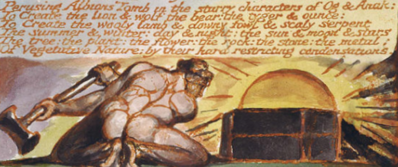 With Los he rebuilds the imaginative human form, which he understands literally, perceiving language itself as a body or building. His most personal fear, consequently, as a prophet-poet embarking on his greatest prophetic-epic task is that in the midst of extreme self-consciousness about his role and medium, as well as his powers, either language or his trembling engraver’s hand will fail—the hill of Zion become Babel. If the Spectre controls either, the Cherubim or true Word is undone and becomes the Covering Cherub of the warring wheel and furnace.