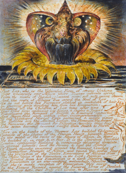 We are reminded that the furnace and wheel are still separate—the “Male is a Furnace of beryll, the Female is a golden Loom”—and, like Hand in the furnace, the “Starry round” is revealed for what it is, the false body of the “Dragon” Antichrist, serpent Satan. At the same time, however, Los glimpses their potential unity in his vision of the still imprisoned Jerusalem as the Cherubim, a temple-body with “Gates of precious stones”. Her “Form is lovely mild … Wingd with Six Wings,” and her bright “forehead … Reflects Eternity”. More important, Los sees in her “translucent” body her own landscape, “the river of life … the New Jerusalem descending out of Heaven” in “flames,” clear as the “rainbow”. Here is a reminder of Erin’s promise in her rainbow that the wheel and the furnace will be united in Jerusalem, who will return to Albion.