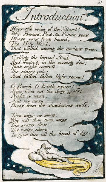 “Hear the voice of the Bard! Who Present, Past, & Future sees”. This sense of the poet as participating in a non-temporal or multi-temporal domain was also recognised by Shelley, who notes in A Defence of Poetry that “A poet participates in the eternal, the infinite, and the one; as far as relates to his conceptions, time and place and number are not.” It is for this reason, he adds, that poets are also prophets: those who can see into the present.