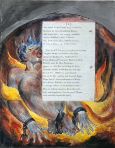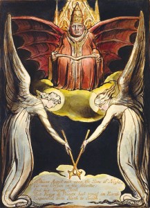 “In his illustration to plate 11 of Europe, Blake depicts a bat-winged Bishop holding across his lap an open book”