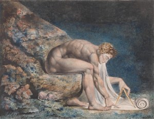 “Blake depicts Newton leaning over at a right angle, looking downwards – literally emphasising his fallen Vision – and measuring the sides of a triangle, which is inscribed on a scroll, with a pair of compasses”