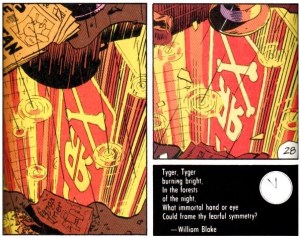 Blake, arguing from the perspective of Natural Theology, presents God-as-Maker in which the act of creation is excruciating, involving the twisting of nerves and sinews to mould the beating heart of the tiger and is, moreover, mechanical, like the making of a clock-world, using hammers and chains. The line “what immortal hand or eye”, which echoes Young’s “Who turns his eye on nature’s midnight face”, suggests a bipartite process of creation, involving both invention or conception – the work of the eye, of design as it exists in the mind – and execution – the operation of the skilled hand forging the design into material being.