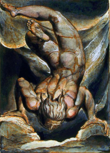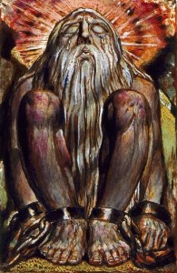 “Sky-born, sky-guided, sky-returning Race!/ Erect, Immortal, Rational, Divine!” Blake was familiar with these types of Rationalising Sky-Gods: in Greek mythology, the similarly left-brain Olympian Sky-gods defeated the more primary and bodily-based Titans – “The Giants who formed this world into its sensual existence and now seem to live in it in chains”, as he put it in The Marriage of Heaven and Hell.