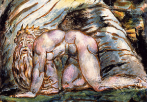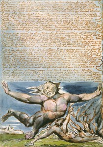 In his design to Night IX lines 1968-1987, Blake portrays a Nebuchadnezzar-like figure crouched like a beast and inhabiting a subterranean world – his fingers are straight and arched, like a pair of compasses, he is covered in hair like the Biblical Cain, and he is pointing downwards towards the earth, and is staring upwards, anguished, at a female, angelic figure who points to the stars. Here, Blake is depicting the Natural Man who is bound down to earth by his own narrowed perception which is bereft of Imagination: “All that we See is Vision from Generated Organs gone as soon as come Permanent in The Imagination, considered as Nothing by the Natural Man”.