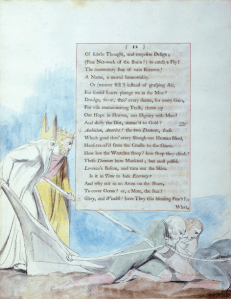 “Young’s conception of melancholy was somewhat unconventional, differing from that found in the likes of Milton’s Il Penseroso, for example” (pic: ‘Melancholy’, from Blake’s illustrations to Milton’s poem). Melancholia was all the rage in the seventeenth-century: from Burton’s classic Anatomy of Melancholy (1621) to Milton’s vision of poetic melancholy in Il Penseroso (1645/1646). It helped prepare the way for the movement towards greater affect and internalised feeling that was to come to fruition in the Romantic period.