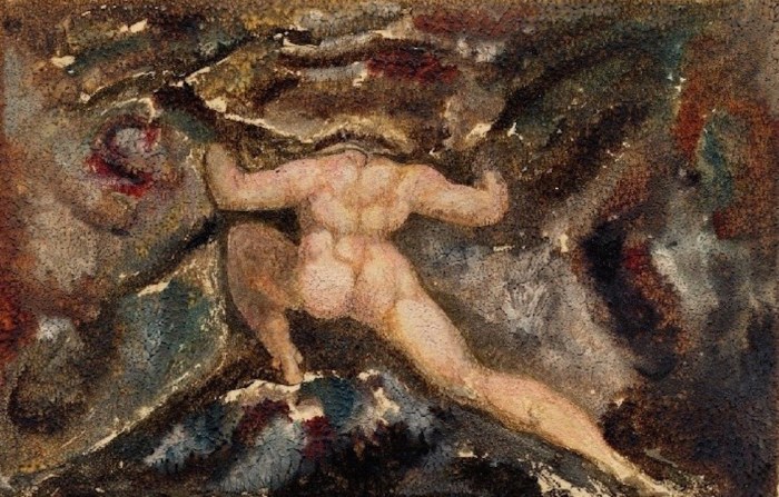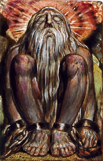 The Eternals refuse Urizen’s Law, casting him down like Milton’s Satan, and alone, broken Urizen begins to shape his (our) universe. To keep watch on him the Eternals send a spirit, Los, who binds fallen Urizen in chains, but in the process becomes bound to him.