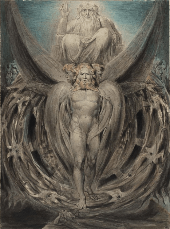 Polysemantic art: “To see beyond the vortex of wheels in which man is caught and relate the Minute Particulars to the Divine Vision is the power of the visionary’s eye: ‘A Spirit and a Vision are not, as the modern philosophy supposes, a cloudy vapour, or a nothing: they are organized and minutely articulated beyond all that the mortal and perishing nature can produce’.” (The Eighth Eye: Prophetic Vision in Blake’s Poetry and Design, by Rachel V. Billigheimer)