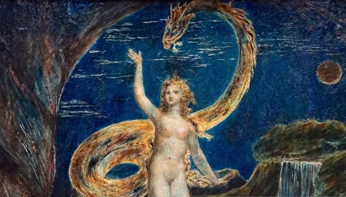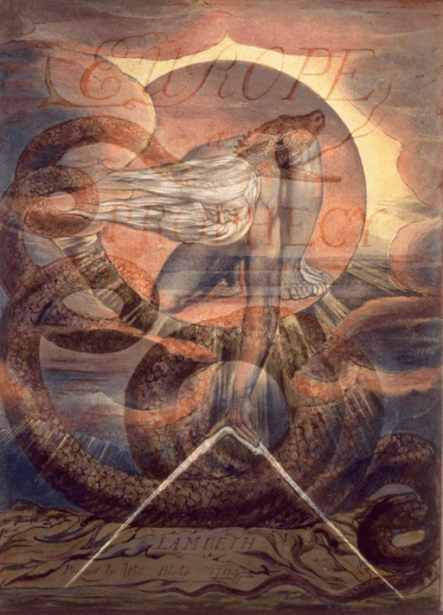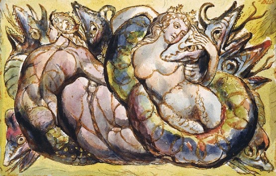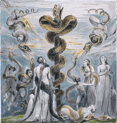 The symbol of the serpent weaves and writhes throughout all ancient human cultures and systems of thought, but what exactly does it signify? Clearly the snake and serpent, insofar as they link with physical, ‘actual’, animals, denote and convey very emotive responses in humans, often concerning issues of death, and protection, relating to their curious shedding of skin (resurrection), their poison (which can also be used for healing, as an antidote or form of ‘vaccine’), their apparent sense of defensive ‘cunning’ or intelligence, their sexualised, wreathing undertones, and their striking mode of motion – a sort of hypnotic, spiral-like wave of coil around coil. They are deeply ambiguous symbols both in those cultures that ‘worship’ then, and those than ‘demonise’ them. And as such we find them rearing their fascinating, transfixing heads, in Blake’s remarkable visions and imagery.