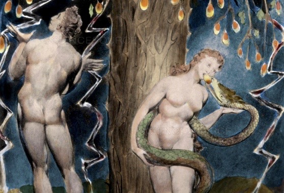 For Blake, the expulsion from “Eden”, an integrated state of psychic wholeness, was indeed a “Fall into Division”, and the “serpent” represents the emergence of the domineering program of left-hemispheric or Urizenic ‘knowledge’ that precipitates this fall within the human body, and the start of the dissociation process – a rationalising, naturalising, and incredibly judgmental (Good & Evil) program or Power, that divides everything into separate parts, with itself on top. “Adam”, with his back to us, represents the deep unconsciousness of this process, the splitting of the human mind into dissociated aspects or parts, another feature or consequence of the “Fall”: